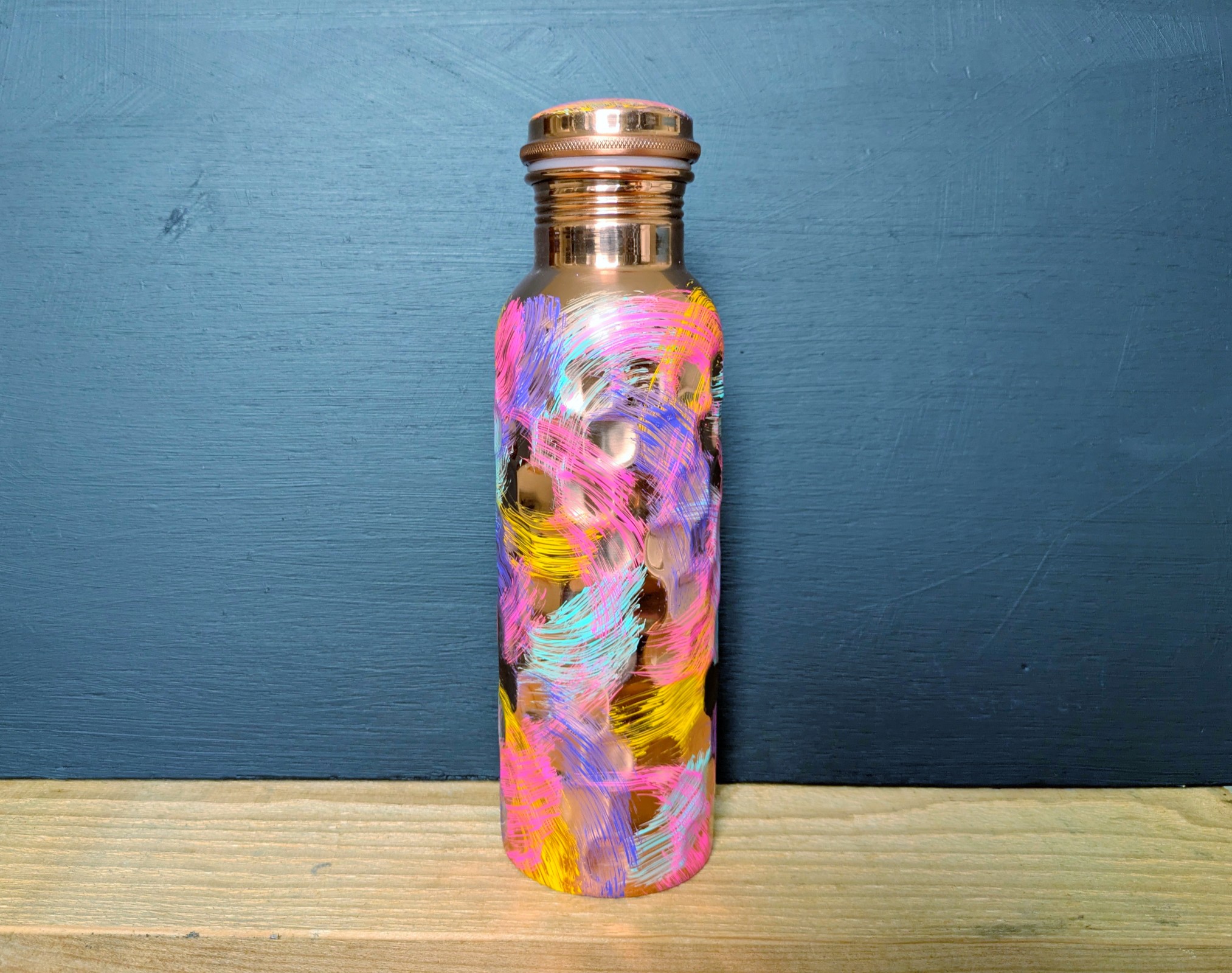 These beautiful pure copper bottles were produced primarily as a health aid and secondarily for their eye catching design. Each one is hand made and hand painted so no two bottles will ever be exactly alike.